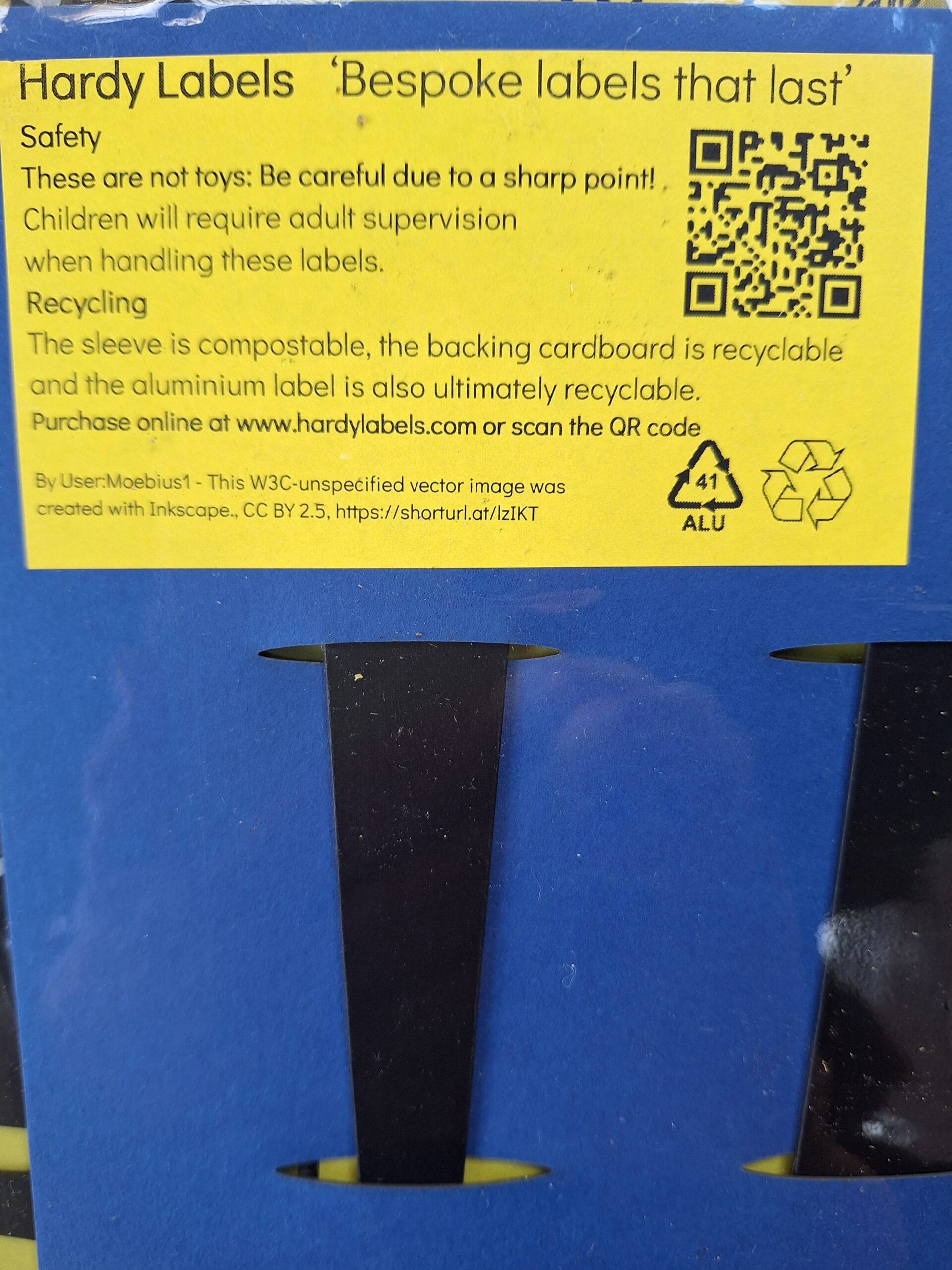 Dimensions of each engraved aluminium plant label. Each label is 10 cm wide by 20 cm high (4 inch by 8 inch). The label area is 10 cm wide by 5 cm high (4 inch by 2 inch). They are also 1.5mm thick to give you a label that lasts. We have our company name discretely engraved on the spike of the label.